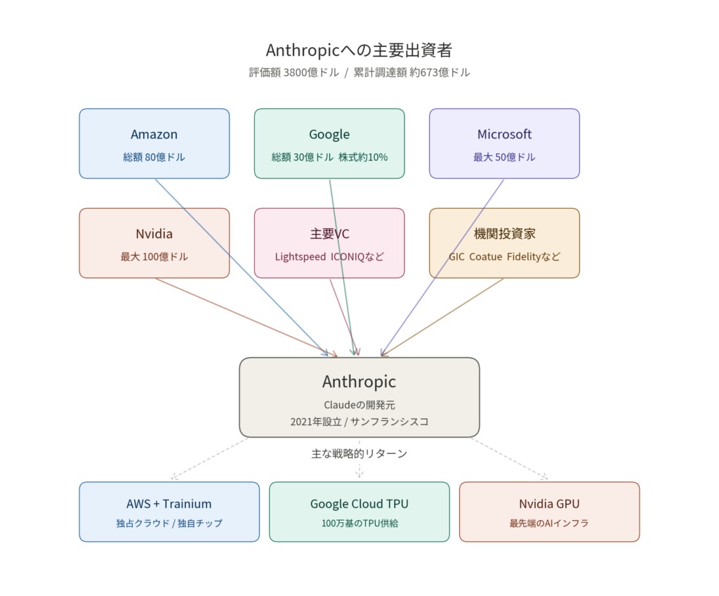 注目ポイント:AmazonとGoogleは競合関係にありながら、両社ともAnthropicに巨額投資を行っています。Amazonが最大の出資者(80億ドル)ですが、持ち株比率ではGoogleが約14%で上回っています。これはGoogleがより初期段階で投資したためです。